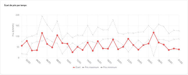 L'écart de prix maximum sur une journée (le spread) a bondi, passant de 94€ en décembre à 130€ en janvier. Concrètement, cela signifie que l'écart entre l'heure la moins chère et l'heure la plus chère d'une même journée s'est considérablement creusé.